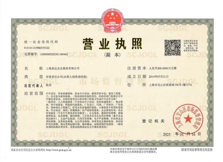 上海晶达企业服务有限公司(简称“晶达企服”) 成立于2014年, 注册资金200万元人民币,是一家专注于服务各企事业单位的全类型后勤服务型企业。